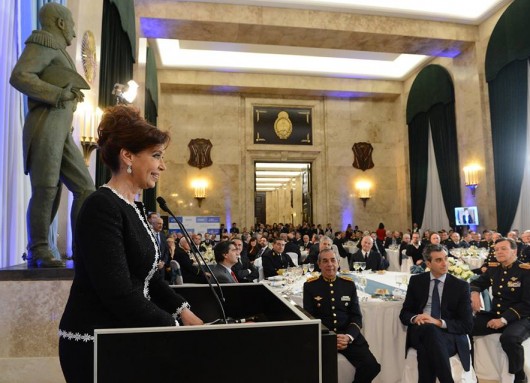También no puedo dejar de recordar la primera oportunidad, en la cual me dirigí como Comandante en Jefe del Ejército, en la habitual Cena de Camaradería, allá por el año 2008 y me acuerdo que – en aquella oportunidad – hablé como uno de los nuevos objetivos que debían plantearse estas nuevas Fuerzas Armadas: la defensa de nuestros recursos naturales. Si mal no recuerdo fue ese uno de los ejes que planteé en ese discurso; uno en ese entonces, en la República Argentina, particularmente, donde estábamos hablando, donde estoy hablando pensábamos obviamente –lo dije yo también- nuestro continente, rico en agua, en recursos naturales, pero parece que Dios ha querido que no solamente fuera agua lo que vamos a tener que cuidar, en los próximos años, sino también – para fortuna de todos los argentinos – uno de los yacimientos más importantes, en materia de gas y petróleo del mundo, que inclusive en el día de ayer, el titular de la recuperada YPF para todos los argentinos, anunciaba un nuevo descubrimiento muy importante, en Meseta Los Perales, en mi provincia, la provincia de Santa Cruz, que es precisamente el lugar donde más petróleo produce YPF, nuestra empresa de bandera. En este caso no es gas shale, sino que es gas convencional, lo cual tiene muchísima importancia y ha redundado en una inversión muy importante.