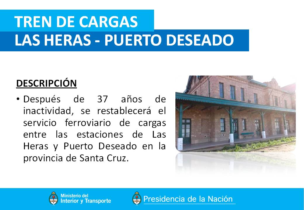 Hoy es un gran día porque el otro gran eje de la conectividad, de la competitividad y la logística, que nos habían arrebatado y clausurado: los ferrocarriles han vuelto, argentinos, nuevamente hay trenes, en la República Argentina. Y no solamente eso, además de toda la renovación de transporte del Gran Buenos Aires; además de Rosario-Buenos Aires; de Mar del Plata-Buenos Aires; de los trenes de cercanía como el de Cañuelas-Buenos Aires; el que se hizo de Encarnación-Posadas, hoy estamos en Santa Cruz, en un lugar histórico. Ese ramal que fue clausurado en 1988 y que une el maravilloso puerto pesquero de aguas profundas, Puerto Deseado, con la localidad petrolera de Las Heras, donde nuestra recuperada YPF tiene una de sus bases centrales era una vía, 285 kilómetros, prácticamente atraviesa todo el norte de Santa Cruz; pasa por Jaramillo, por Fitz Roy, por Pico Truncado hasta llegar a Las Heras y es también histórico, sobre esas vías, creo que a la altura de Jaramillo, fue asesinado Facón Grande, ese patriota, de las huelgas del 21, él era ovejero. Porque ese ferrocarril fue pensado por los ingleses para sacar la lana por Puerto Deseado, ahora recuperada esas 285 kilómetros con 90 millones de pesos de inversión, porque estábamos restaurando algunas partes que estaban en mal estado, pero el resto está bien y lo vamos a terminar, en 90 días, ahora YPF va a poder llevar sus tubos sin costura y sus varillas de acero por el tren de carga, dándole mucha mayor competitividad y mucha mayor economía a la actividad petrolera. Y además que el tren vuelva a pasar, por Puerto Deseado, por Tellier, por Fizt Roy, por Jaramillo, por Pico Truncado para llegar, finalmente, a Las Heras y estoy segura que Yacimientos Petrolíferos Fiscales Sociedad Anónima hará un pequeño ramalcito hasta Cañadón Seco, que es el otro ramal, muy cerquita ahí, también de la actividad petrolera.