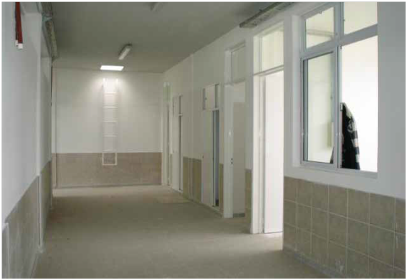Es una escuela de tres plantas: 4 Aulas, taller electromecánica, patio, área de gobierno, taller automatización, taller RG, 2 talleres de electromecánica, taller instalaciones y un patio cubierto.