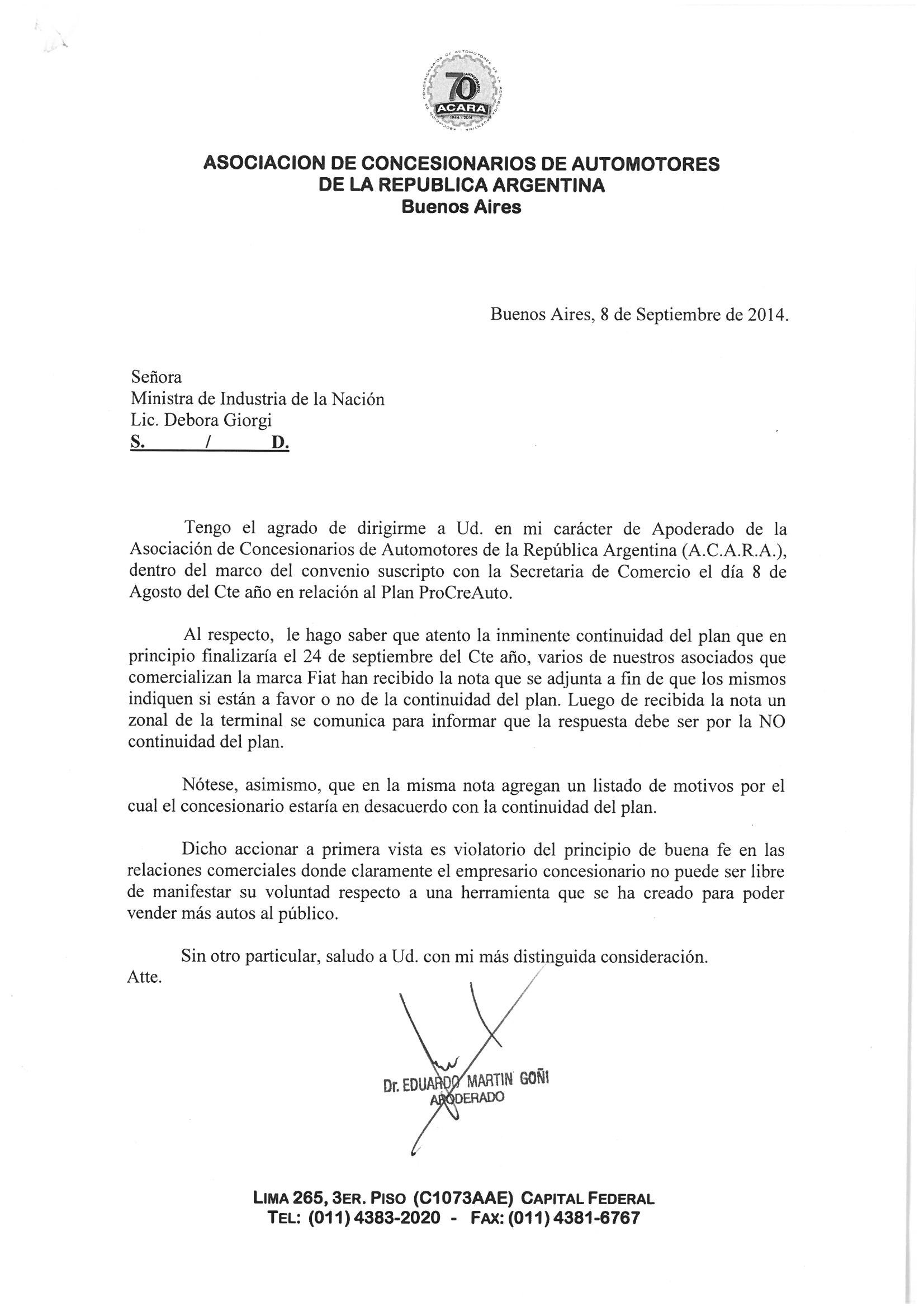 Ustedes saben que hoy nos reunimos con los titulares de terminales, concesionarias y sindicalistas del sector automotriz. Bueno, un rato antes de la reunión la Ministra Deborah Giorgi me alcanza una nota remitida por la Asociación de Concesionarios de Automotores de la República Argentina (ACARA) con un formulario anexo que se explica por sí sólo.